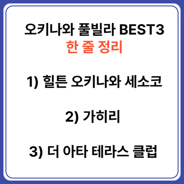 이번 비교에서는 힐튼 오키나와 세소코 리조트(Hilton Okinawa Sesoko Resort), 가히리 리조트(Kagili Resort), 더 아타 테라스 클럽 타워스(The Atta Terrace Club Towers) 이 세 곳을 중점적으로 살펴보겠습니다.
